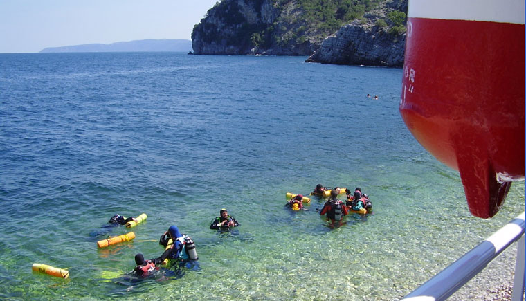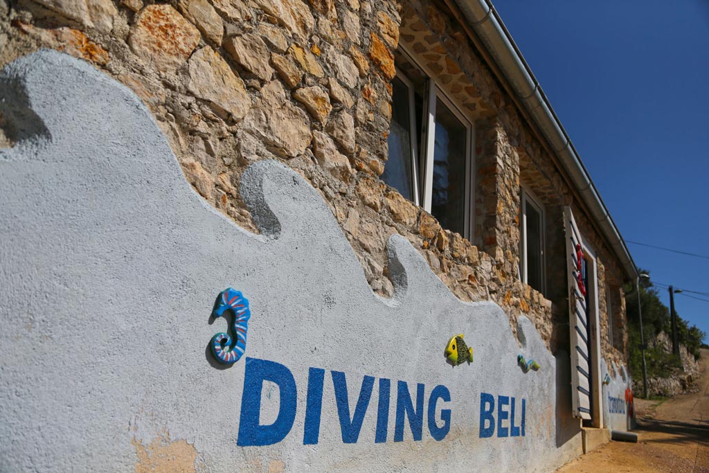 Naša ronilačka baza smještena je na lijepoj šljunčanoj plaži Pod Beli. Plaža Pod Beli je jedino mjesto na Cresu koje nudi mogućnost prekrasnih urona direktno sa plaže tako da je ulazak u more i opremanje ronioca prilagođeno početnicima i iskusnim roniocima.